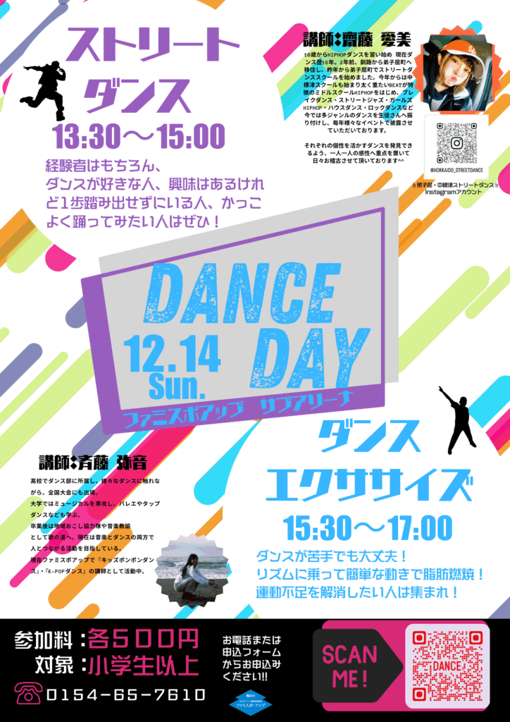 経験者はもちろん、ダンスが好きな人や興味のある人、苦手だけど楽しく運動したい人も気軽に参加できる内容をご用意しました